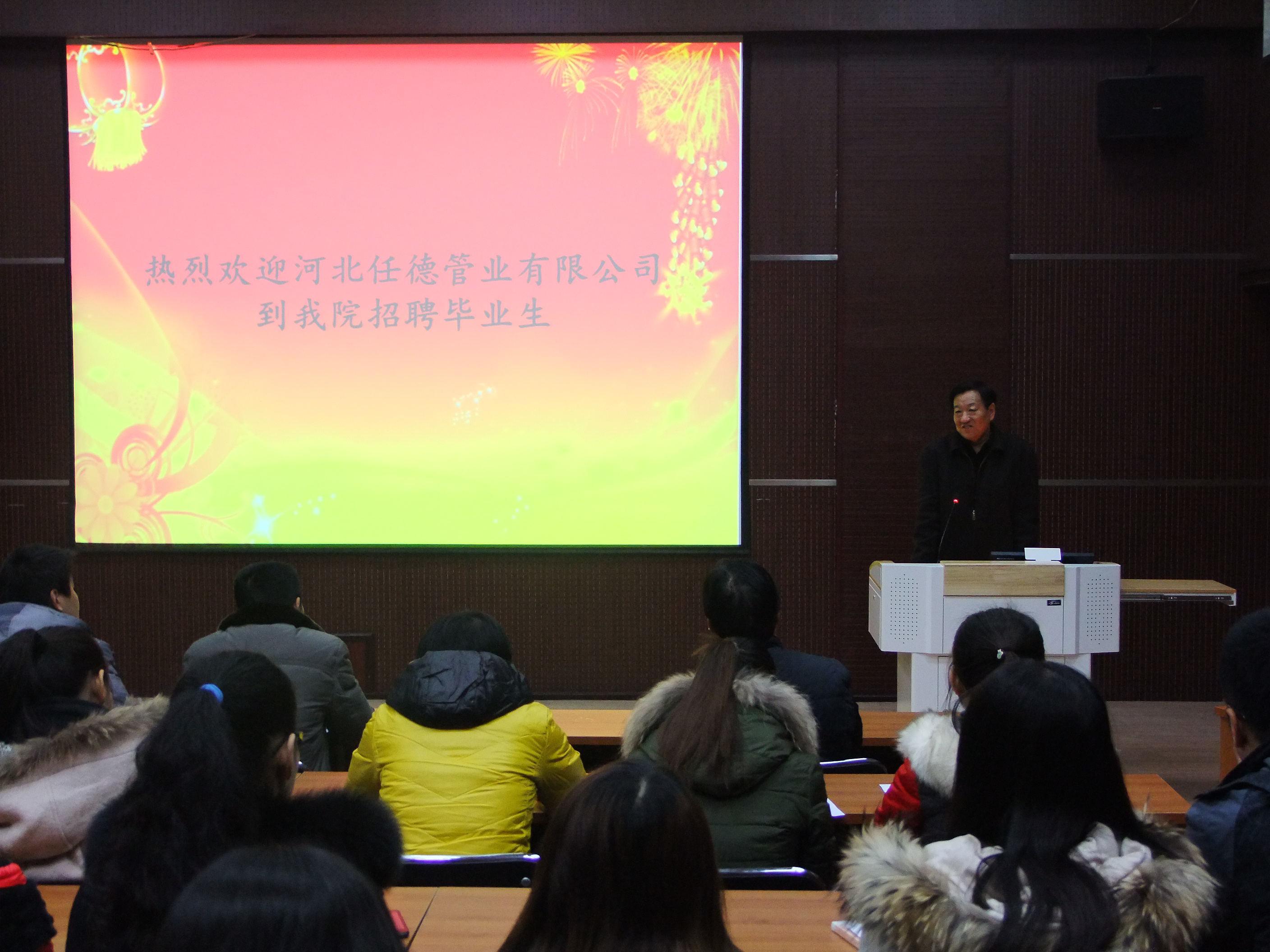 首先,马书记了解了学院目前的就业状况,针对当前的就业形势、就业政策、就业观念、就业时限等问题对就业工作提出了指导性意见,并亲自为学生联系用人单位。河北任德管业有限公司总经理贾亚威介绍了公司的历史、现状和发展前景,详细说明了此次招聘的岗位需求和职业发展情况,并与参加应聘的同学进行了现场互动,就相关问题为学生详细解答。毕业生也精心准备了求职简历,积极与企业招聘人员进行交流,主动了解招聘单位的情况以及用人要求。经过招聘人员认真筛选和简单面试后,12名毕业生与用人公司达成共识,同时学院也将进一步加强校企合作,推动毕业生就业。