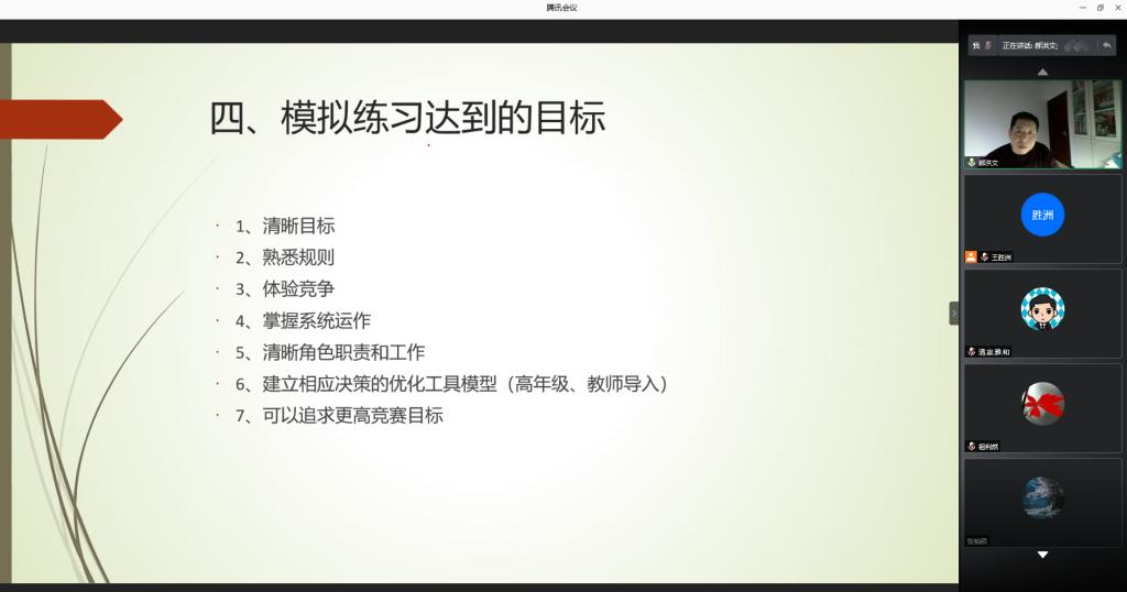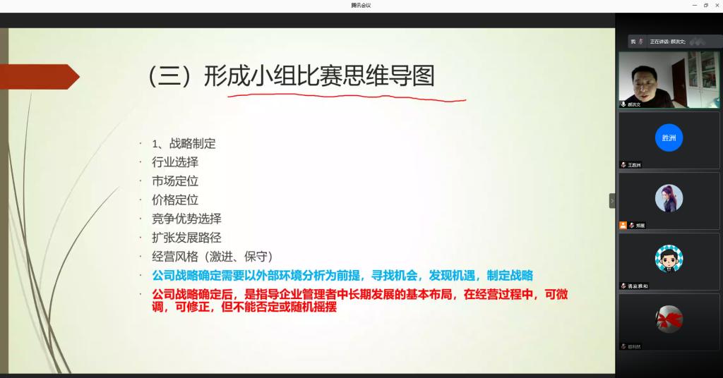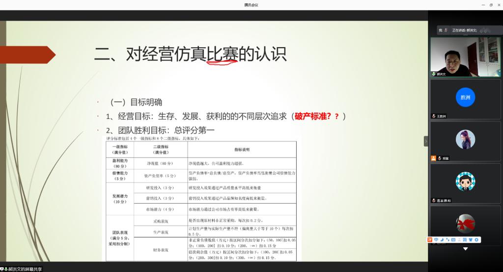 为提升参赛师生对赛事的认知水平,加强师生对规则的深度理解,助力师生构建系统战略思想,做到以赛促学,学院于1月24日下午,通过腾讯会议,举办企业运营仿真竞赛线上培训。培训由副院长王胜洲主持,企管系资深教师郝洪文主讲,院党委副书记梁泽锋、各系正、副主任以及各参赛团队指导教师和150余名参赛学生参加培训。