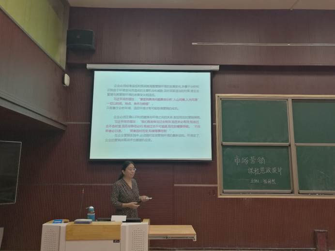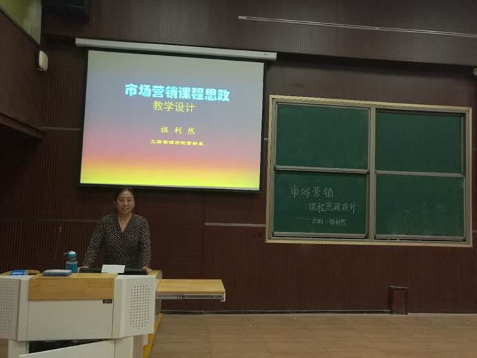 祖利然副教授结合专业,介绍了市场营销“课程思政”的目标、内容、原则和方法,认为首先在思想观念上要确立 “育人”目的,深入学习党的十九大精神,学习党和国家以及业务主管部门对应的经济、政治、文化、社会、生态或党建的相关理论,从中挖掘思政元素,进而结合专业课程谈思想、说素养、讲故事,把思政教育渗透进学习过程的每一环节,包括培养方案、教材选用、课前预习、课堂教学、课后作业、案例讨论、社会实践等方面。在将思政元素融入专业教学,运用马克思主义立场、观点和方法解释相关内容的同时,教师还要注重以德立身、以德立学、以德施教,为学生点亮理想的灯、照亮前行的路。最后,她以“宏观环境分析”一节为例,直观地展示了专业课程思政教学设计方案,并与参会的老师进行了深入讨论和交流。