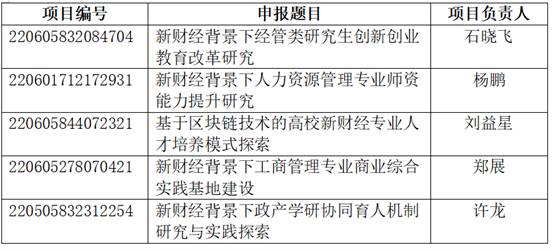 近日,教育部高等教育司公布了2022年第一批产学合作协同育人项目立项名单。星空体育官网石晓飞院长主持、与广州中博教育股份有限公司合作的《新财经背景下经管类研究生创新创业教育改革研究》,杨鹏老师主持、与上海踏瑞计算机软件有限公司合作的《新财经背景下人力资源管理专业师资能力提升研究》,刘益星老师主持、与北京知链科技有限公司合作的《基于区块链技术的高校新财经专业人才培养模式探索》,郑展老师主持、与北京百智享科技有限公司合作的《新财经背景下工商管理专业商业综合实践基地建设》,许龙老师主持、与广州中博教育股份有限公司合作的《新财经背景下政产学研协同育人机制研究与实践探索》获批2022年第一批产学合作协同育人项目立项。