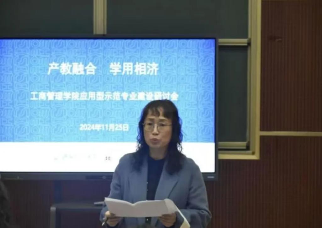 李桂荣院长在会上发表重要讲话,强调应用型示范专业建设既是学校未来工作的核心要点,也是学院优化发展的关键任务。她表示,应用型示范专业建设的关键在于培育学生综合能力,教师需积极引导学生参与实习实践,助力其提升专业素养,增进自我与社会认知;还应充分运用自身社会资源,灵活运用各种形式拉近学生与管理一线的距离,促进校企深度融合。