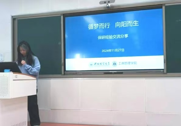 已经获得保研资格的2021级周李楠同学从自身经历出发,结合对我校推免文件的解读,为学弟学妹们系统介绍了保研准备过程、各种注意事项以及四六级备考要点等。她强调了专业成绩的重要性,鼓励大家精心选课,认真上课,并从六大方面分享了提升专业课成绩的做法。最后,她鼓励同学们在注重学业成绩的同时,积极参与学科竞赛、撰写科研论文、参加调研项目等实践活动,以提升自身学术能力。