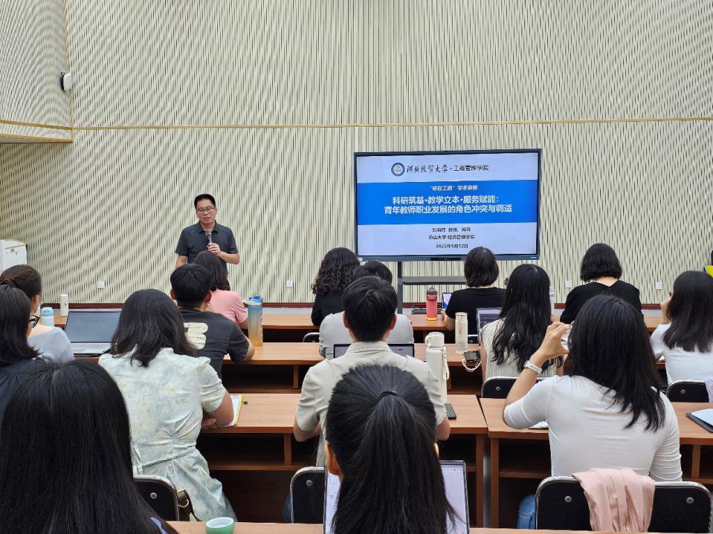 9月12日,周末专家河北行·青椒成长营系列活动之“研在工商”学术讲座于MBA一教室举行,由燕山大学刘海鸥教授作题为“科研筑基·教学立本·服务赋能:青年教师职业发展的角色冲突与调适”的学术报告。会议由星空体育官方网站李桂荣教授主持,副院长封雪韵、石晓飞及学院青年博士教师参加。