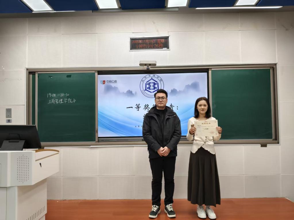 公务员模拟大赛决赛获奖名单揭晓,同学们依次登台领奖,由团委书记王晓东、中合公考赞助商郝亚雄代理及学生会执行主席宋泓霏依次为获奖学子颁发荣誉证书与奖品,对他们在赛事中展现的扎实知识储备和清晰答题逻辑给予高度认可。