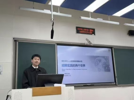 为打破理实壁垒、深化产教融合,将企业前沿实战经验精准转化为育人资源,2025年11月25日,人力资源管理系特邀请学院签约实践教学基地单位——快乐沃克人力资源股份有限公司的李晓宇经理和猎头部门负责人李尚凯走进校园,以《人员招聘与素质测评》为主题,为学生们带来一场干货满满的专题讲座。活动由系副主任王丽媛副教授主持,本系两个班级的学生齐聚现场,认真学习。