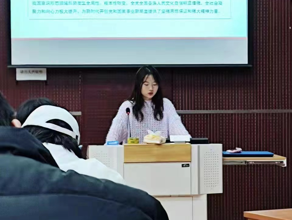 会议伊始,吕雅诗向同学们介绍了本次班会的主题内容,带领同学们一起学习了党的十九届六中全会公报。随后,吕雅诗带领大家回顾了党领导全国各族人民坚持和发展中国特色社会主义的历史进程和宝贵经验。最后,她讲到了党的十九届六中全会精神,希望同学们深入思考、主动作为,胸怀更加宽广,志气更加高远,学习更加努力,用美好青春点燃未来!