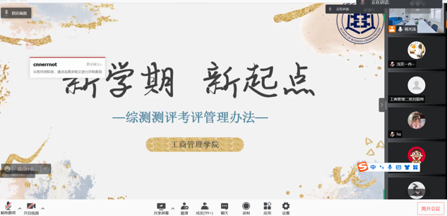 范伟对上学期成绩不合格的个别同学进行教育警示,提示学生应端正态度,认真学习,在新学期、新起点,要相信自己,保持积极心态,争取在本学期的学习中取得优异成绩,做好新学期个人发展规划。贾晶晶对综合测评管理办法进行简要说明,注重学业水平的同时多参与各类竞赛,铭记在求索“大学之道”的路上交上优异答卷。杨光泽从重复奖项累加问题、实践与志愿服务区别、核算方法、测评小组四个方面详细讲解了此次综合测评管理办法的实施细节。