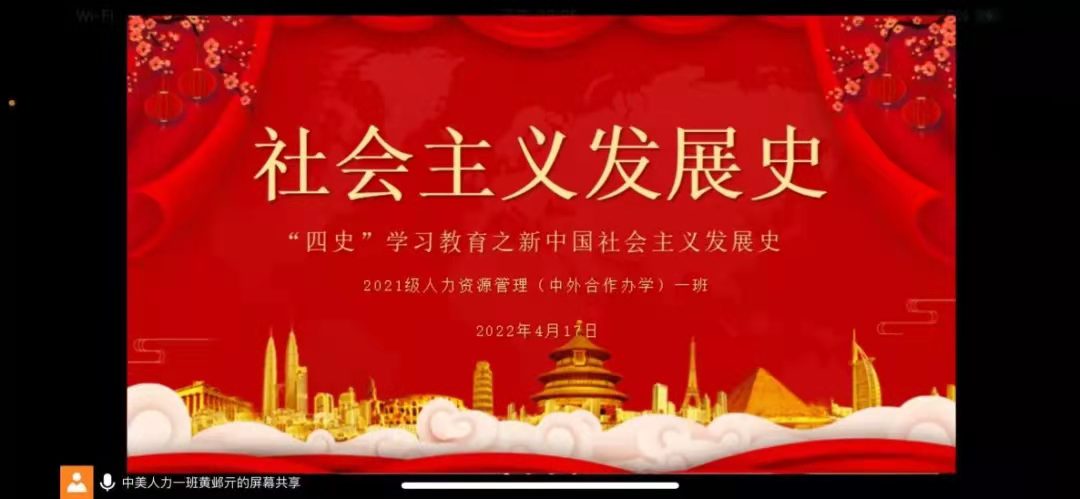 为深入学习了解习近平新时代中国特色社会主义思想,使同学们更加了解中国特色社会主义发展史,4月17日下午,2021级人力资源管理(中外合作办学)一班于线上开展“‘四史’学习教育之新中国社会主义发展史”主题团日活动,此次团日活动由团支书黄邺亓策划并主持,2021级人力资源管理(中外合作办学)一班全体同学参加。