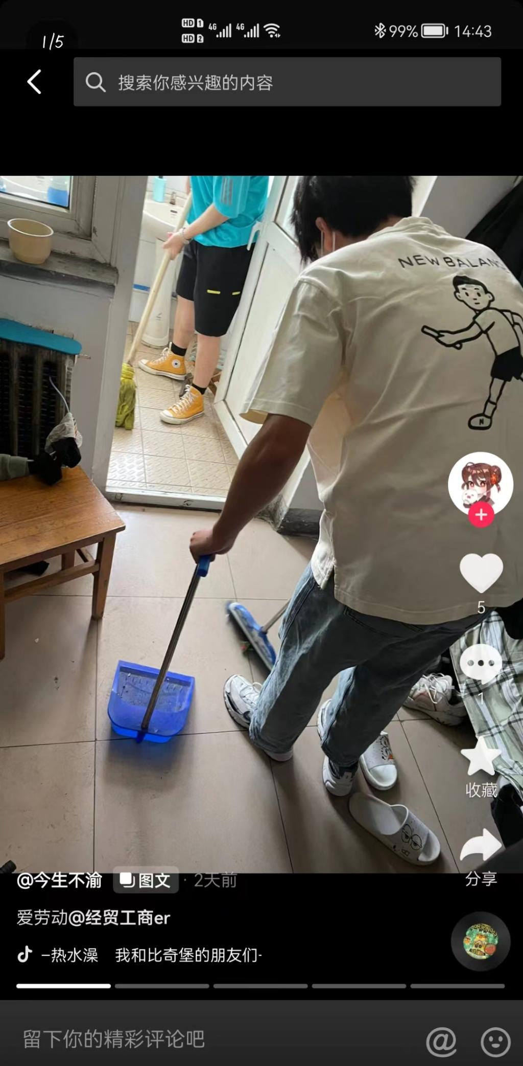 2021级智慧工商一班李浩罡,他爱劳动,主动打扫宿舍,清扫地面垃圾,在劳动中收获快乐,锻炼自己。优秀的背后,是他一心一意,竭尽全力的无私奉献和任劳任怨的务实精神,就像一头老黄牛,没有驰骋千里,却一步一步地达到了“劳动最光荣”的顶峰。