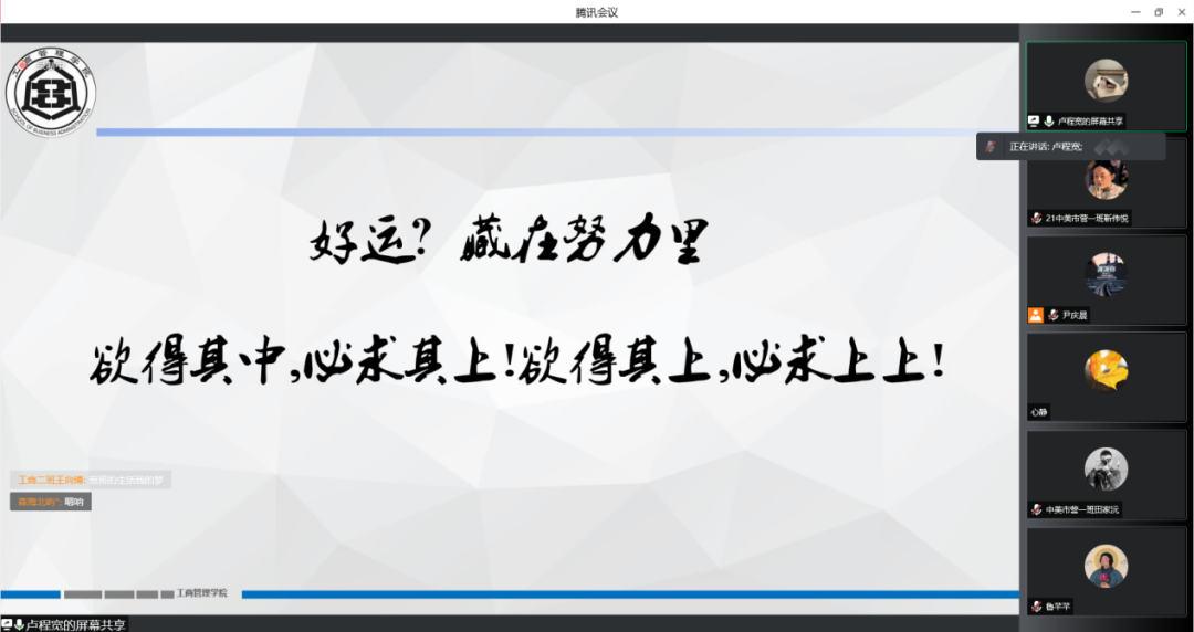 4月10日晚上,星空体育官方网站于腾讯会议线上举行职业愿景工商“行”之“人生是场马拉松,重要的是一直在跑”主题会议,本次会议邀请到星空体育官网2021届优秀毕业生卢程宽进行交流分享,学院教师、学生共200余人参加。
