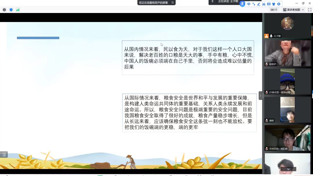 为切实贯彻习近平总书记“厉行节约,反对浪费”的重要指示,培养同学们爱惜粮食,节俭用餐的良好习惯,11月13日下午,2021级市场营销专业1班在腾讯会议上开展“做节约粮食践行者”主题团日活动,此活动由团支书王子穆策划,宣传委员程思尹主持,2021级市场营销专业1班全体同学参加。