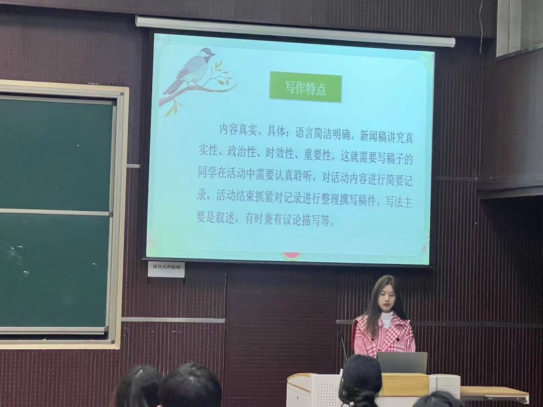 随后,团委事务组织中心负责人陈惠淋就材料总结工作为同学们进行讲解。她表示团日活动材料需做到封面时代化、内容丰富化、图片精选化、文字格式化、序号标准化。紧接着,新闻中心负责人白成玉讲解新闻稿撰写的注意事项,分别从文件综合整理、格式正确规范、内容言简意赅和图文并茂四个方面进行了讲解。分享环节过后,同学们向学姐们提问有关团务工作和撰写新闻稿件的问题,相互交流学习,认真汲取宝贵经验。