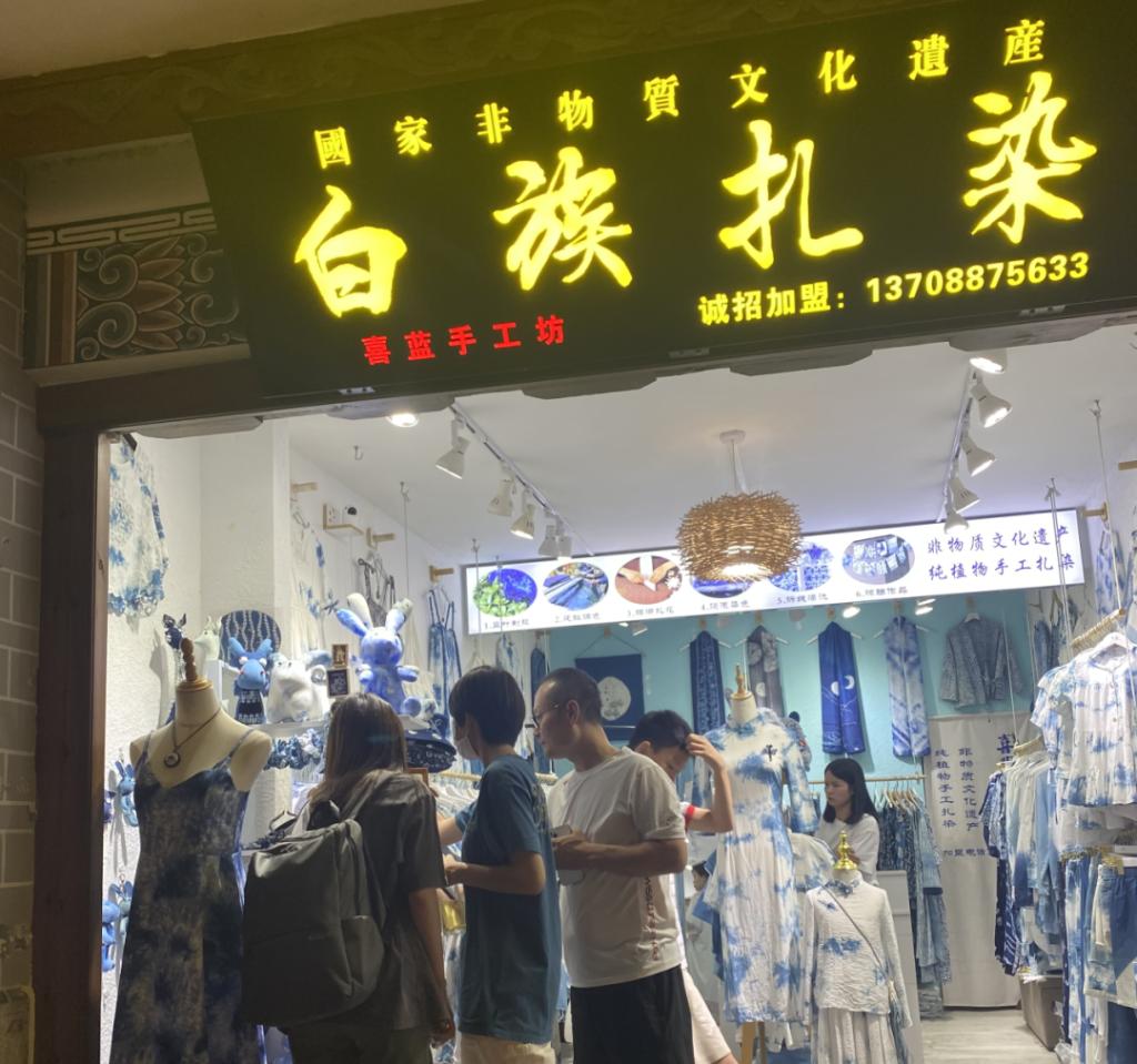 随后,我们去了解了当地很有名的白族扎染。白族扎染的染料很特殊,采自苍山上生长的寥蓝、板蓝根、艾蒿等天然植物制作而成。其中用得最多的是蓝靛草“板蓝根”,它染出的颜色青里带翠,凝重素雅。白族扎染主要以蓝色和白色为主色,扎染的蓝与白,透过千年时光,浸染成为白族人生活的底色。白色在白族地区是吉祥的象征,青色则象征希望、纯朴和真挚,青白结合代表白族人“清清白白,光明磊落”。
