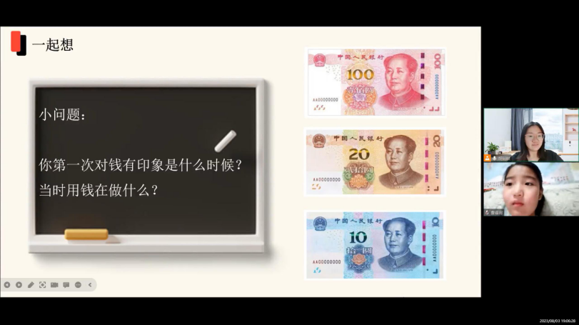 在“云课堂,乐成长”中,我选择了少儿财商科普教育课程,并通过腾讯会议开展本次课程,用生动的绘本故事告诉小朋友如何赚钱、花钱、存钱,用提问互动的方式吸引小朋友的注意,引导她初步形成对钱本质的认知,引发其思考。在课堂上,我还设置“猜一猜”的环节活跃气氛,增强互动,更好地培养小朋友理性消费、目标规划的能力。课堂氛围十分轻松活跃。我们在欢声笑语中结束了云课堂的这几节课。