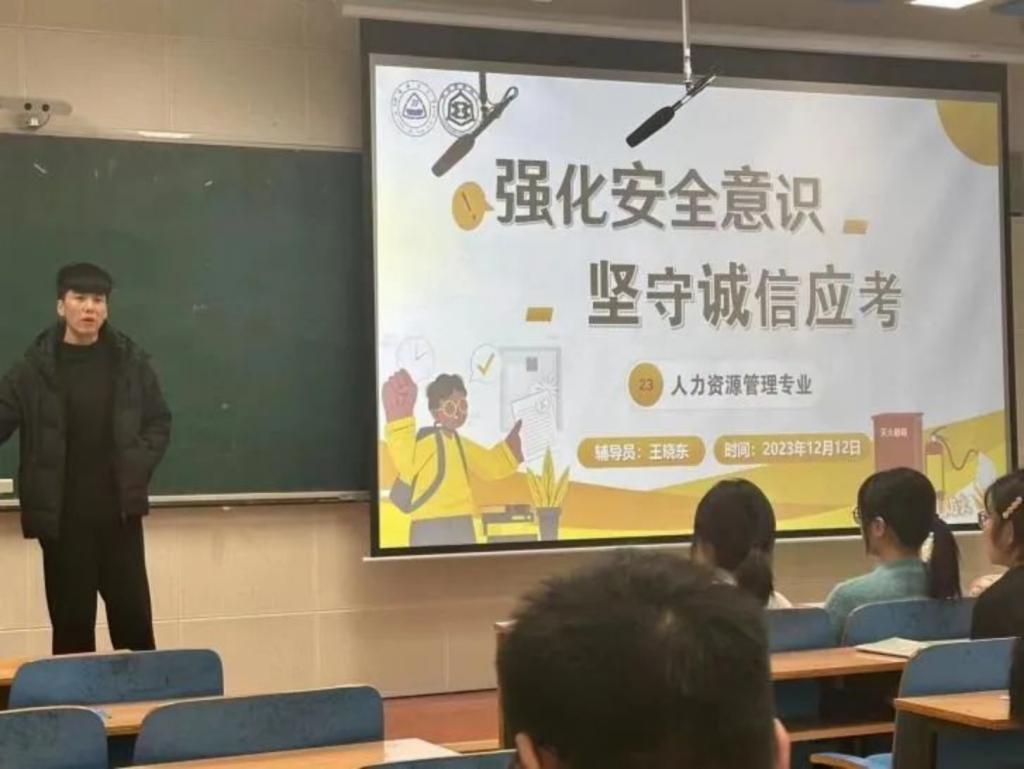 为进一步提高同学们的安全意识和诚信意识,加强考试管理,推动营造公平公正的考试环境,12月12日下午,星空体育官方网站人力资源管理专业2023级开展“强化安全意识,坚守诚信应考”主题班会。本次班会由辅导员王晓东老师策划主持,2023级人力资源管理专业全体同学参加。