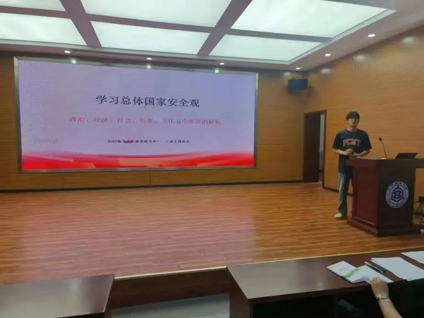 会议伊始,班长郝路航主要围绕政治安全、经济安全、社会安全、军事安全、文化安全五个方面讲述总体国家安全观的主要内容以及大学生如何提高自身的防范意识和应对能力,引导同学们准确把握总体国家安全观的核心要义,树立正确的法制观念。随后,佟紫嘉同学分享了近期学习总体国家安全观系列活动感悟,对大学生如何领悟总体国家安全观、提高法制观念做出进一步阐述。