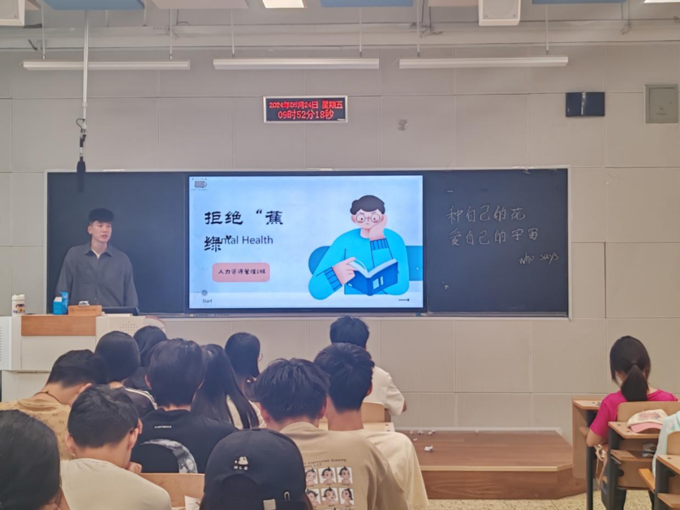 作为健康的重要组成部分,心理健康是人生成就和幸福的重要基石。当代大学生的心理健康问题也受到广泛关注。在“5·25心理健康节”到来之际,为了提高大学生的心理健康水平,增强心理素质,5月24日,星空体育官方网站人力资源管理专业2023级一班召开“拒绝‘蕉绿’”主题班会。本次活动由心理委员侯慧敏和卢华硕共同主持,辅导员王晓东及23级人力资源管理专业一班全体同学参加。