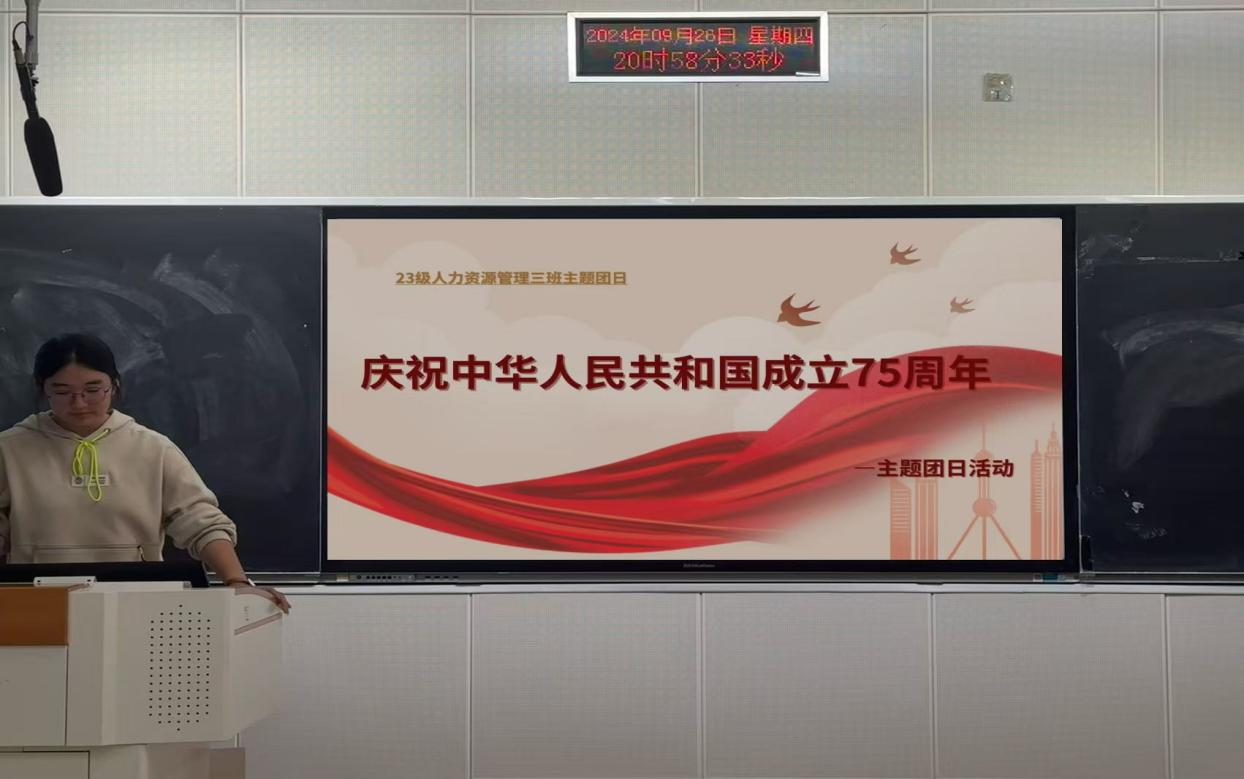 为弘扬爱国主义精神,增强同学们的民族自豪感和责任感,激励广大青年学子为实现中华民族伟大复兴的中国梦贡献力量。10月22日,星空体育官方网站2023级人力资源管理专业三班开展了以“庆祝中华人民共和国成立75周年”为主题的团日活动,本次团日活动由团支书杜悦涵主持,2023级人力资源管理专业三班全体同学参加。