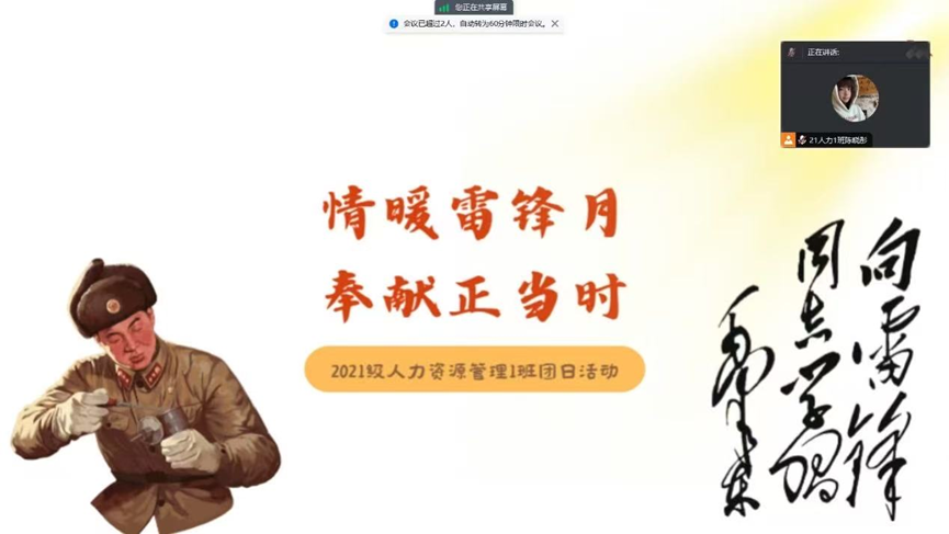 为弘扬雷锋精神,加强社会主义文化建设,引导广大青年积极投身社会建设之中,3月25日,2021级人力资源管理一班团支部开展了“情暖雷锋月,奉献正当时”主题团日活动,此次团日活动由团支书陈晓彤主持,2021级人力资源管理一班全体同学参加。