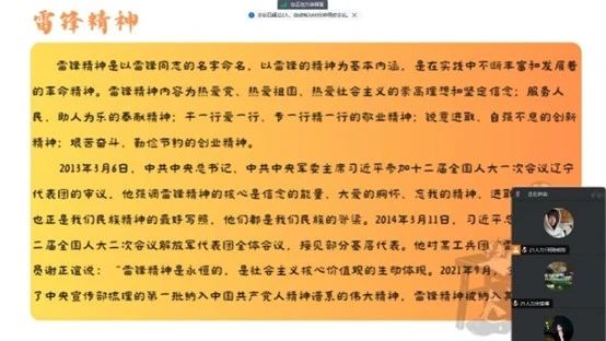 活动伊始,陈晓彤带领同学们回顾了雷锋精神的内涵。她介绍,雷锋精神的内涵丰富,包括爱党爱国爱社会主义的坚定信念、服务人民的奉献精神、精益求精的敬业精神、锐意进取的创新精神、艰苦奋斗的创业精神。她强调,雷锋精神是纳入中国共产党人的精神谱系的伟大精神,我们青年也要不断传承发扬雷锋精神,将其作为我们的精神纲领与行动指南。