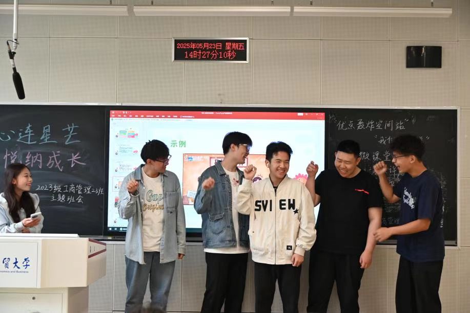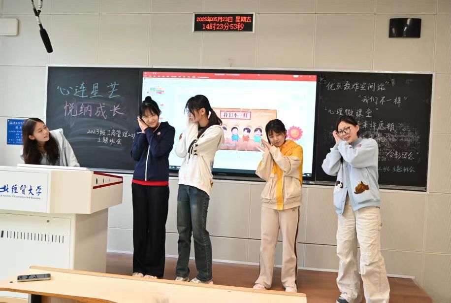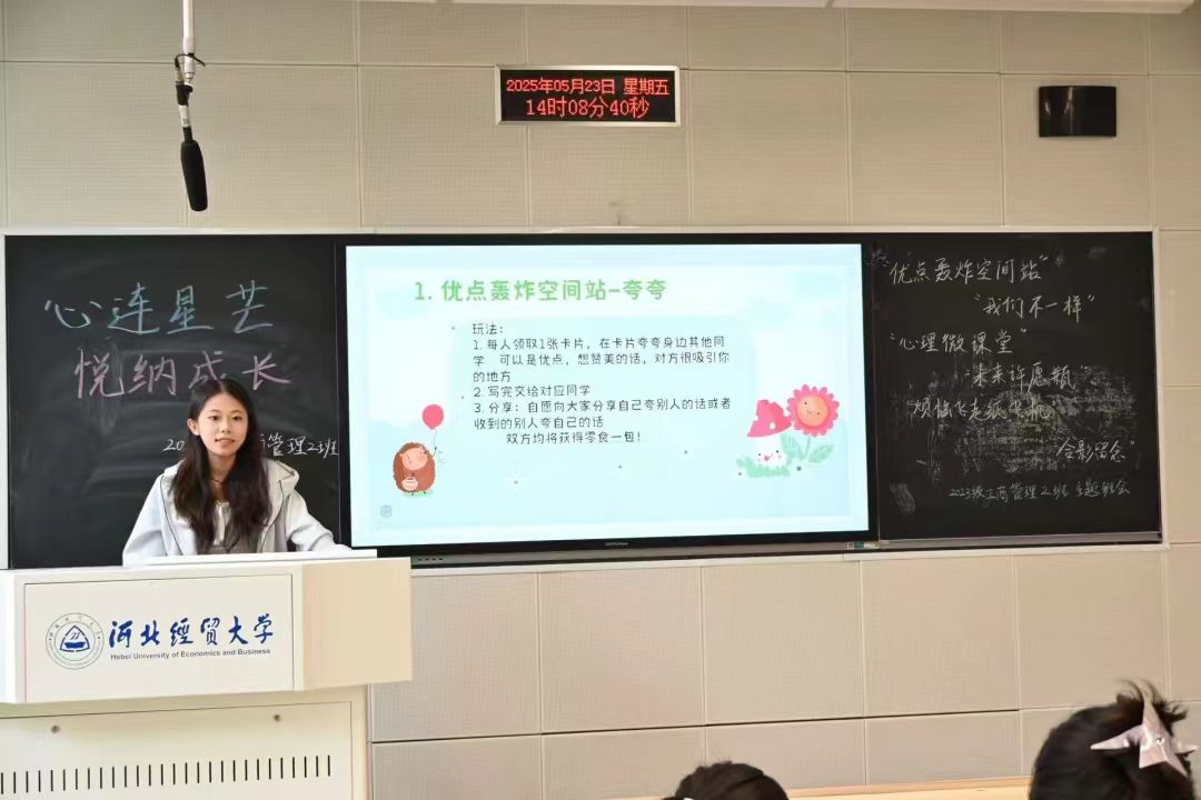 为引导学生树立积极向上的心态,促进学生的健康成长,提升班级的凝聚力与同学的归属感,5月23日下午,星空体育官方网站2023级工商管理2班在A205教室成功开展了“心连星芒,悦纳成长”主题心理班会,此次班会由心理委员张思盈主持,工商管理专业2班全体同学参加。