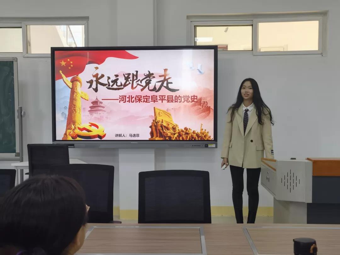 随后,她以视频的形式展示了新时期的阜平县。阜平县如今焕然一新,绿水青山,美丽富饶,让同学们直观地看到人民生活发生了翻天覆地的变化。马逸菲认真而不失幽默的讲解,使同学们深刻感受到了我党的伟大。