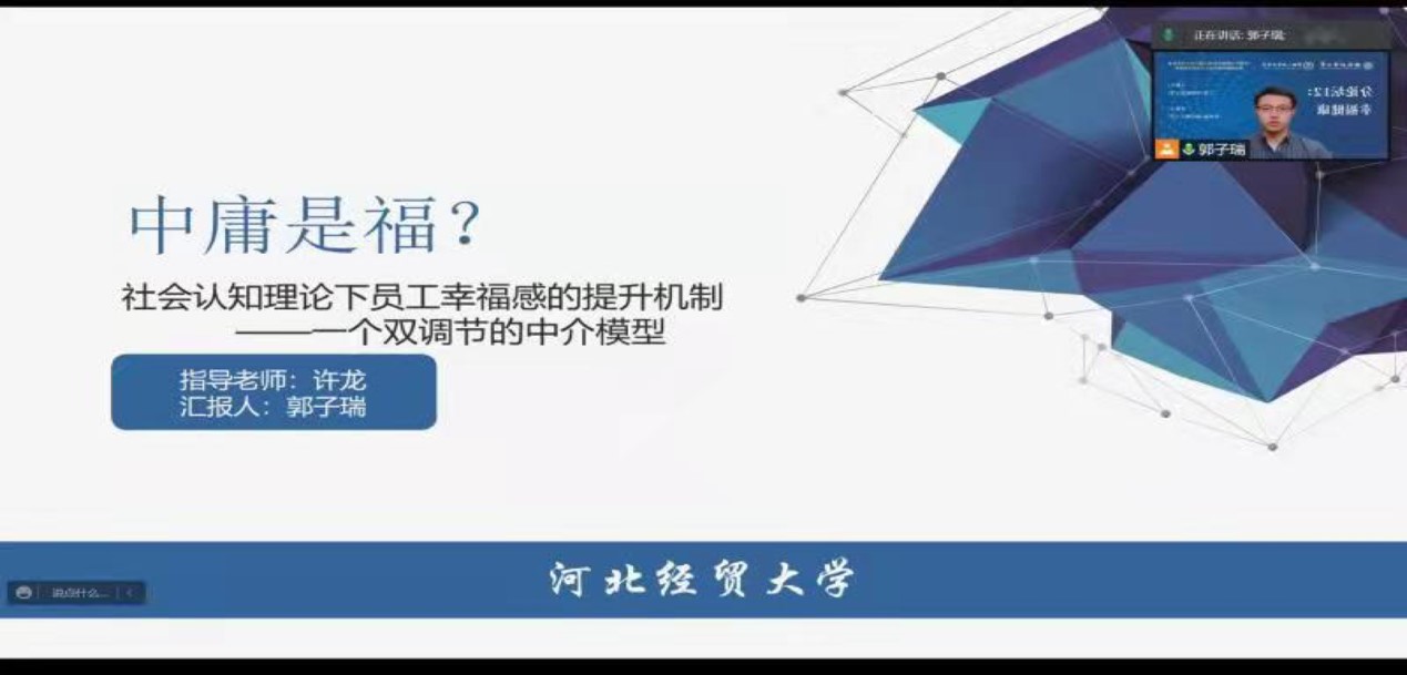郭子瑞从文化自信与和谐社会背景出发,汇报了中庸思维提升员工幸福感的机制研究。首先,对当前管理学研究趋势和社会热点进行了分析,指出中庸既是中国特色的人格特质又是组织中的中国智慧,而幸福感也在以人为本趋势下愈发受到人们的关注。其次,细致地解释和分析了模型的主要变量,并对变量间的关联逻辑进行了理论上的推导与假设。然后,介绍了数据的收集和处理的过程。最后,得出了研究结论,阐述了该研究的理论和现实意义,指出了未来发展方向。
