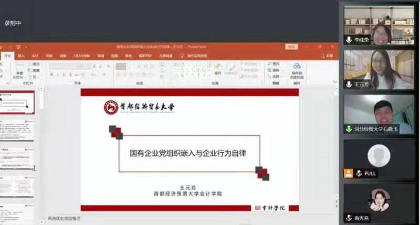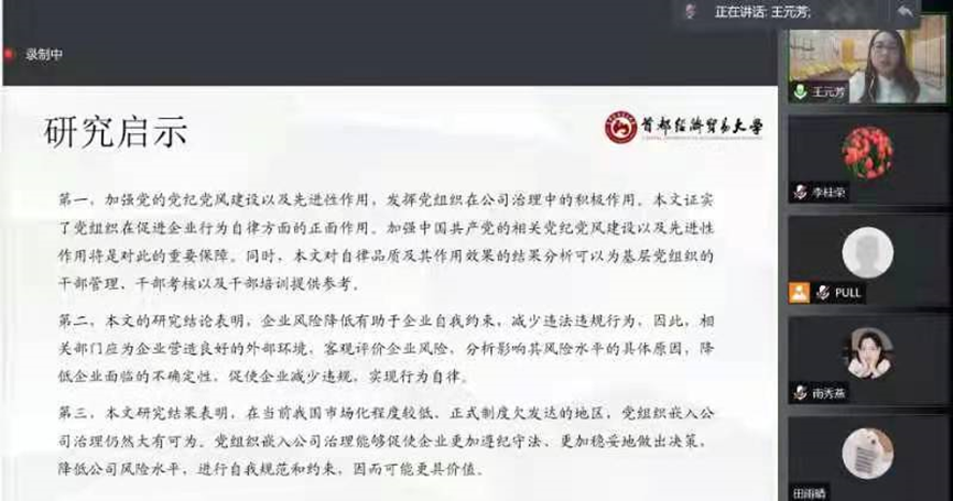 11月26日晚,星空体育官方网站第四届公司治理与企业成长高端论坛在线上举行。首都经贸大学会计学院王元芳博士应星空体育官方网站邀请,通过腾讯会议平台作题为“国有企业党组织嵌入公司治理与企业行为自律”的学术报告。本次会议由星空体育官方网站院长李桂荣主持,学院教师及研究生共100余人参加。