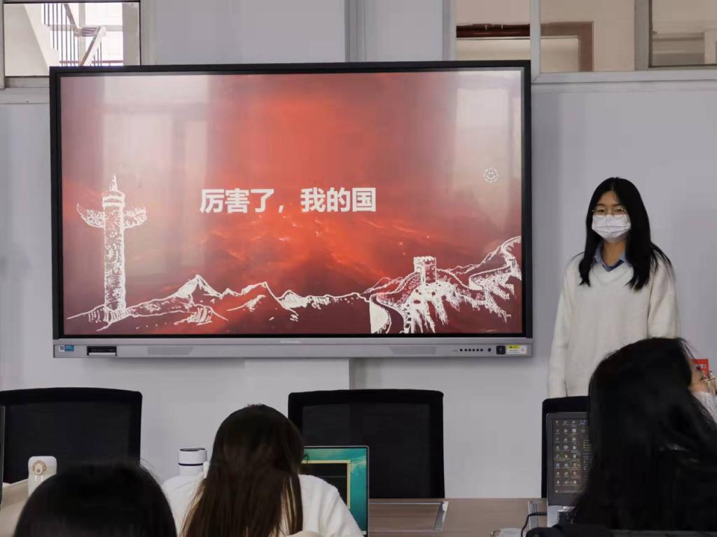 主讲人曹雪芬同学以“厉害了,我的国”为主题,从中国电影、中国成就、中国安全及中国体育四个方面展示了中国的强大。首先,简单概括了《长津湖》及《长津湖之水门桥》两部影片的剧情,指出学习和弘扬伟大的抗美援朝精神是我们当代青年的职责和使命。进而提出虽然我们生活在和平年代,但永远不能忘记美好的生活是革命先烈们抛头颅、洒热血而奋斗来的。随后,向大家展示了中国脱贫攻坚及全面建成小康社会的伟大成就。打赢脱贫攻坚战是我党取得的重大成就,是政治优势和制度优势的充分彰显。全面小康的圆满收官,突出了中国特色社会主义现代化道路以人民为中心、维护公平正义的制度理念,表示我们完成了第一个百年奋斗目标,这是一个伟大的胜利,同时也是通向下一个伟大胜利的新起点。面对突如其来的疫情,中国人民坦然面对,敢于担当。中国疫情取得阶段性胜利,离不开以习近平同志为核心的党中央坚强有力的领导、集中力量办大事的中国特色社会主义制度优势、新中国成立以来社会主义现代化建设形成的综合实力以及中国人民团结一心、同舟共济的英勇奋战。最后,她展示了中国体育飞跃发展的成果,指出中国体育精神是以“为国争光、无私奉献、科学求实、遵纪守法、团结协作、顽强拼搏”为主要内容。在2022年的北京冬奥会上,中国奥运健儿发扬为国争光、顽强拼搏、团结协作的中华体育精神,勇夺9枚金牌、4枚银牌、2枚铜牌,首次位居金牌榜第三位,创造我国参加冬奥会的最好成绩,为祖国和人民赢得了荣誉,为北京冬奥会的圆满收官作出了重大贡献。中国通过承办冬奥会,宣传中华灿烂文明和优秀文化,展示大国实力和精神风貌,增强民族凝聚力和自豪感,进一步振奋了民族精神。最后,强调我们应该学习冬奥会精神,学习奥运健儿的拼搏精神,用拼搏奋斗的力量去工作,用团结友善的品质去生活。
