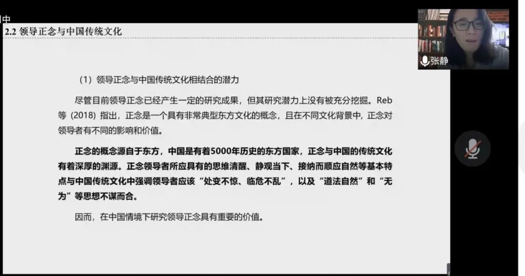 6月12日晚,星空体育官方网站张静博士通过腾讯会议平台作了题为“组织中的领导正念研究与中西方领导者的正念实践”的学术报告。本次会议由星空体育官方网站副院长石晓飞主持,学院教师、MBA学生等100余人参加。