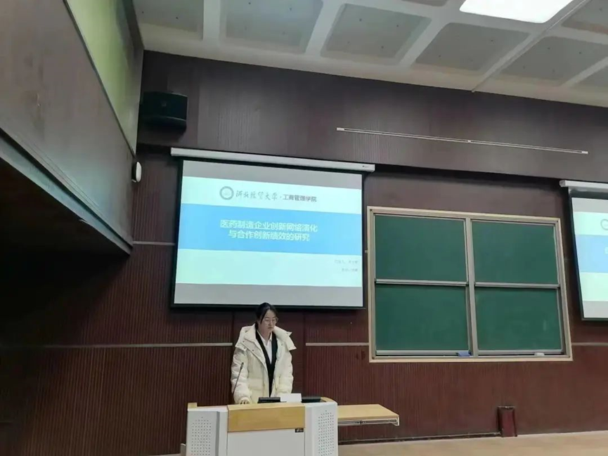 汇报人吴玉果以“医药制造企业创新网络演化与合作创新绩效的研究”为题,分析我国医药制造企业合作创新发展现状,在测量与分析医药制造企业创新网络特征、归纳网络特征发展规律的基础上分析网络结构与合作创新绩效的效应关系,并通过门槛效应模型探讨吸收能力的最优作用区间。结合研究结果,从优化创新网络结构、强化网络特征及吸收能力作用的角度出发,提出企业合作创新的新路径,为提高企业合作创新绩效提供参考。