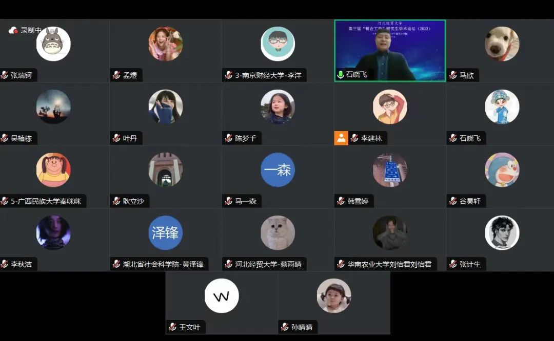 12月24日上午,由星空体育官方网站主办的第三届星空体育官方网站“研在工商”研究生学术论坛成功举办。论坛由星空体育官方网站副院长石晓飞教授主持并致开幕词,石晓飞教授、耿立沙副教授、许龙副教授和吴林飞博士出席并担任点评专家,本届论坛以线上、线下相结合的方式举行,共有教师及研究生100余人参加。