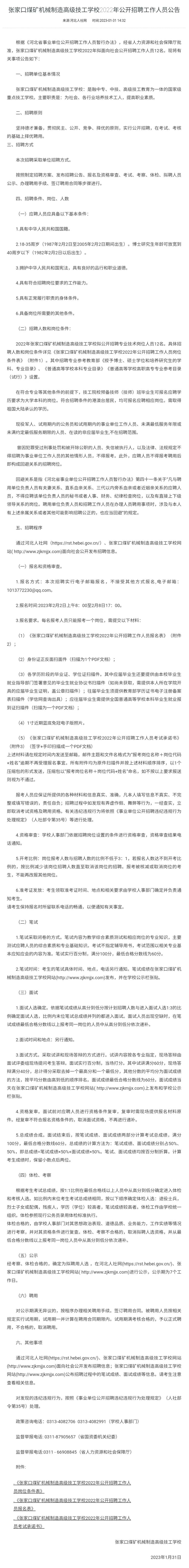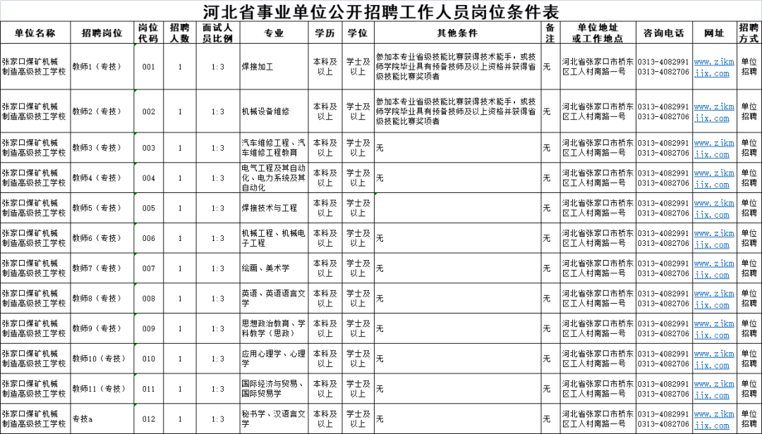 张家口煤矿机械制造高级技工学校2022年拟面向社会公开招聘工作人员12名。具体招聘人数和岗位条件详见↓↓↓