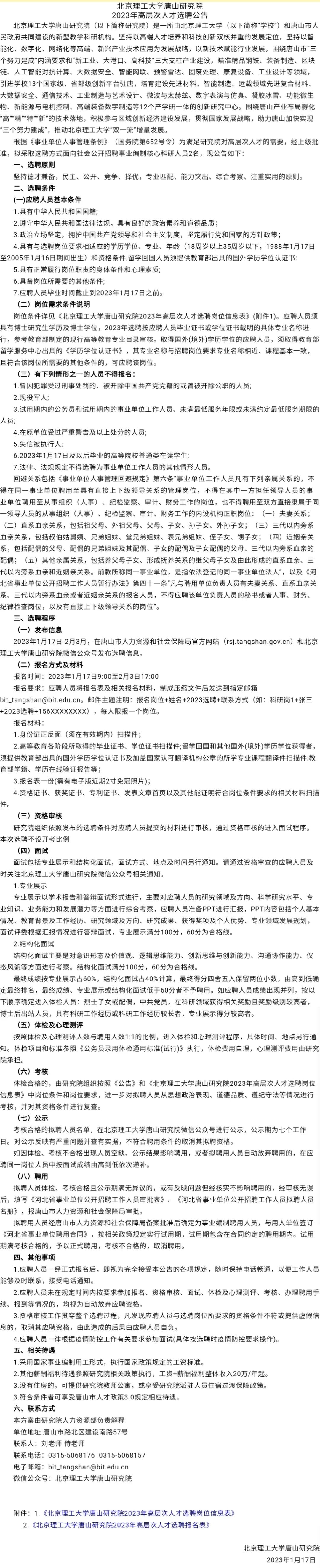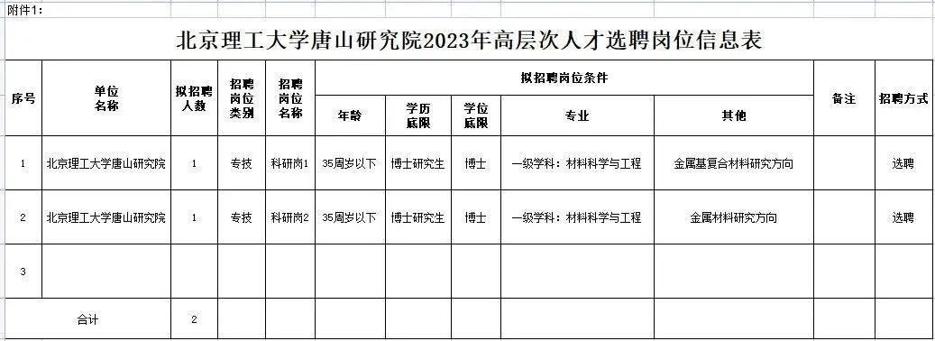 北京理工大学唐山研究院面向社会公开招聘事业编制核心科研人员2名。具体招聘人数和岗位条件详见↓↓↓