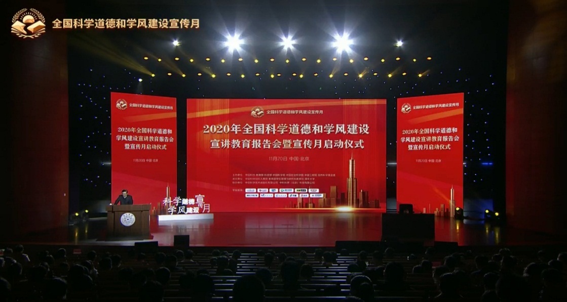 中国科学技术协会党组书记、常务副主席、书记处第一书记怀进鹏主持会议,首先,全体起立奏唱中华人民共和国国歌,其次,怀进鹏书记宣布全国科学道德和学风建设宣讲教育正式开始。最后,介绍了出席会议的嘉宾。接下来由十三届全国政协副主席,致公党中央主席,中国科学技术协会主席,暨南大学董事长万钢为此次报告会致辞。并介绍此次的嘉宾是前敦煌研究院院长樊锦诗院士和神舟飞船总设计师戚发轫院士。