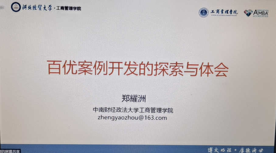 12月16日下午,中南财经政法大学案例中心副主任、全国百优案例函审专家郑耀洲副教授星空体育官方网站邀请通过腾讯会议作题为“百优案例开发的探索与体会”的线上专题报告。报告由星空体育官方网站副院长石晓飞主持,校内教师、学院教师和研究生共一百余人参加。