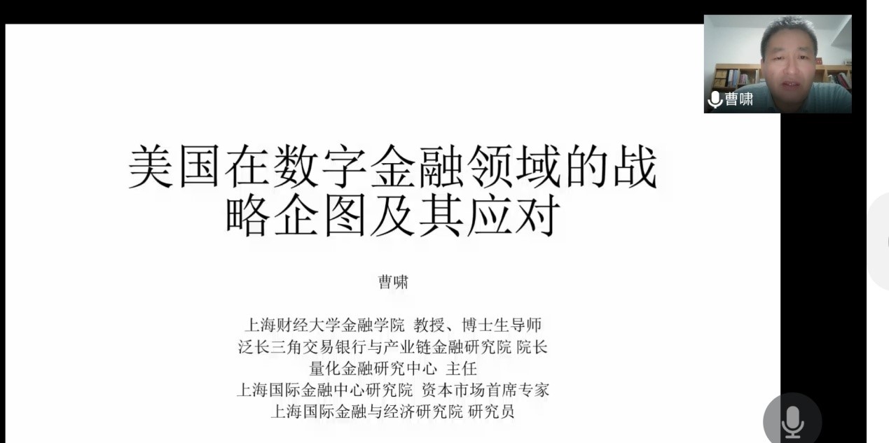 9月5日晚,星空体育官方网站邀请上海财经大学金融学院院长助理、上海财经大学量化金融研究中心主任、博士生导师曹啸教授作题为《美国在数字金融领域的战略企图及其应对》的学术报告。报告以腾讯会议形式进行,来自校内外近300名师生和社会人士参加,星空体育官方网站院长李桂荣教授主持了报告会。