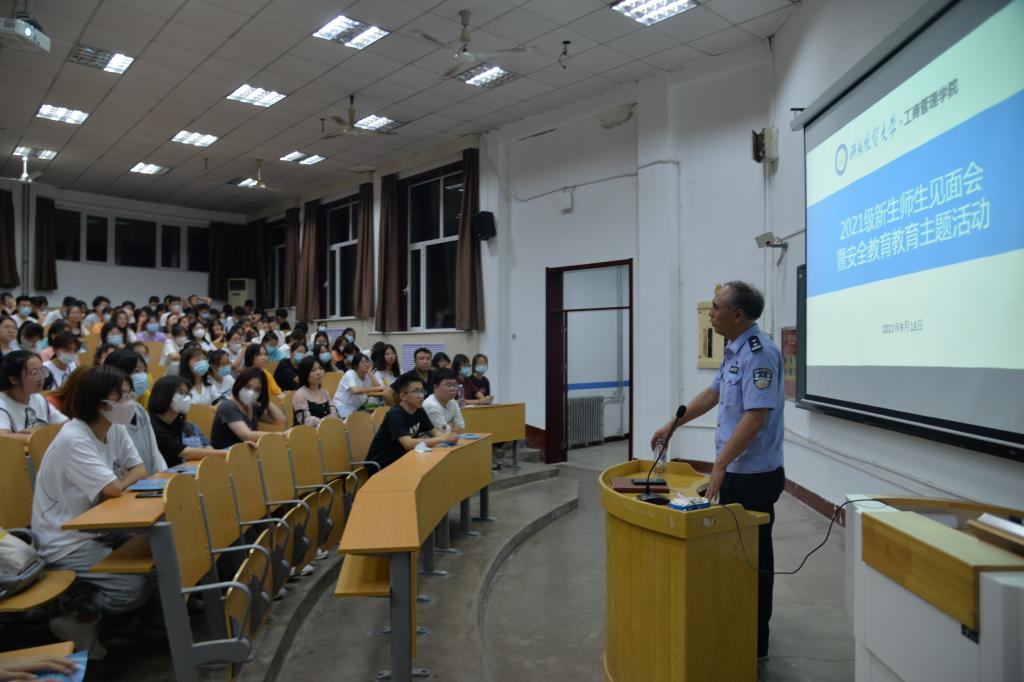 9月13日,星空体育官方网站在第二教学楼举办2021级新生师生见面会暨安全教育主题活动。学院党委书记张霖、院长李桂荣、正处级辅导员马章山、副院长石晓飞、五七路派出所所长崔青槐到场,学院各级辅导员和2021级全体新生参加。本次活动由学院党委副书记范伟主持。
