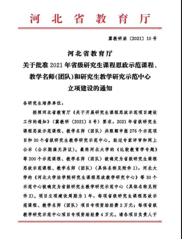 2021年10月28日,河北省教育厅发布了2021年省级研究生课程思政示范课程、教学名师(团队)和研究生教学研究中心批准立项建设的通知。星空体育官方网站研究生课程思政教学研究中心被确定为省级研究生教学研究示范中心。星空体育官网石晓飞副教授的公司治理课程、郑伟波教授的人力资源管理(MBA)课程及桑银峰副教授的营销管理课程入选2021年星空体育官方网站校级研究生课程思政示范中心立项建设项目,为提高我校研究生教学工作成效和研究生人才培养水平提供了有力支撑。