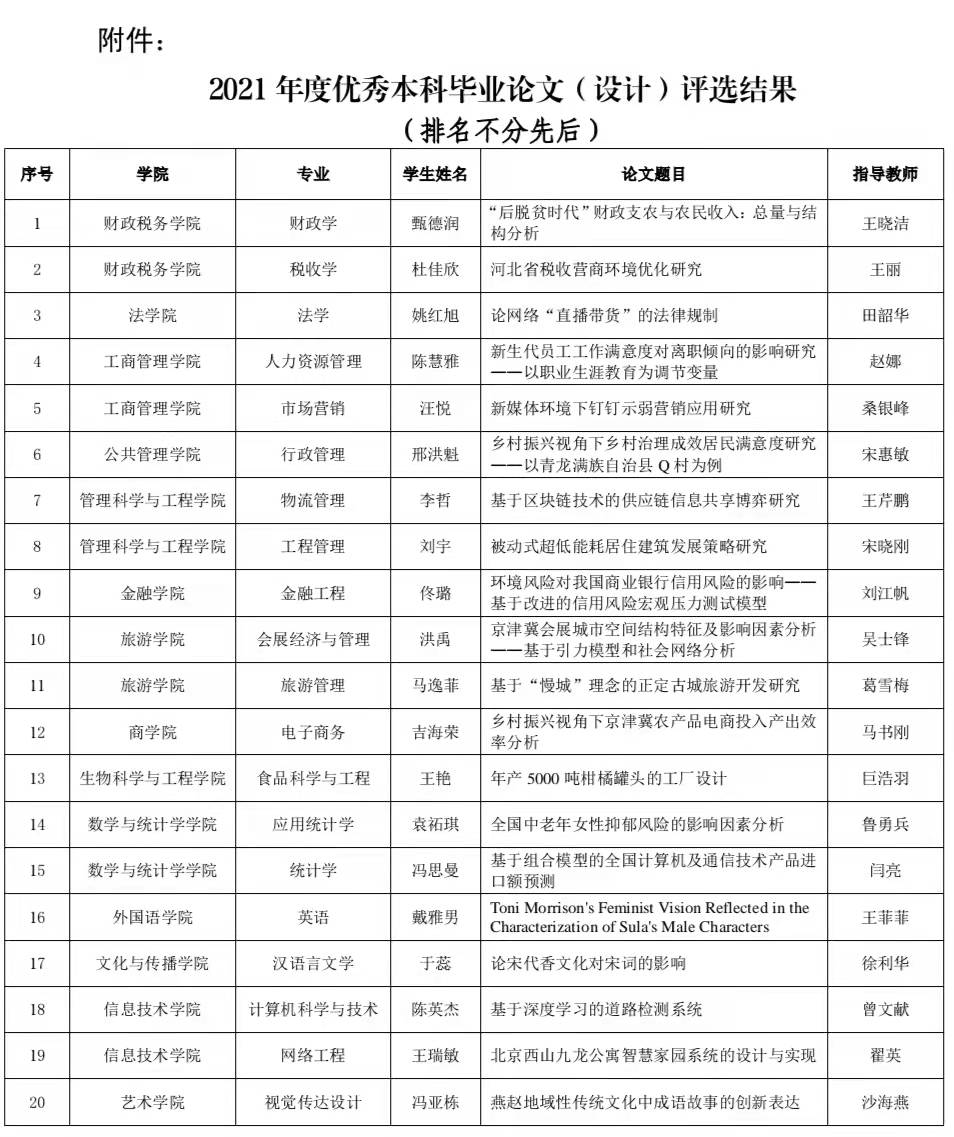 为进一步提升我校本科毕业论文(设计)质量,鼓励毕业论文(设计)指导教师勤勉治学,根据《星空体育官方网站普通本科毕业论文(设计)管理办法(2021 年修订)》(冀经贸教〔2021〕59 号),学校于本月组织开展了 2021 年度优秀本科毕业 论文(设计)评选工作,评选出 20 篇优秀毕业论文(设计)