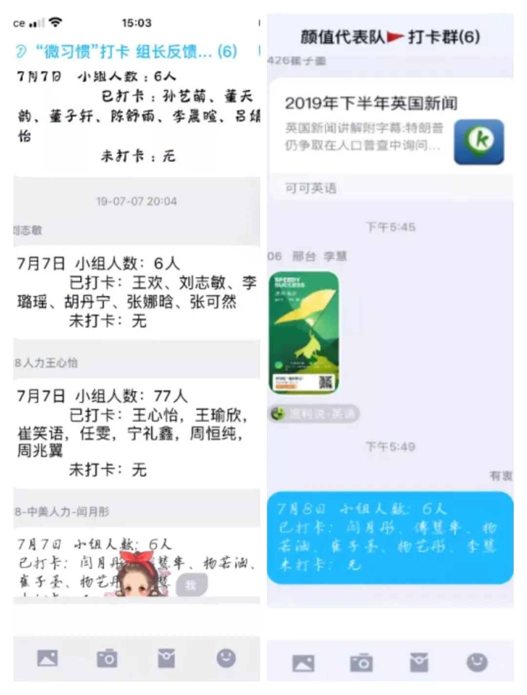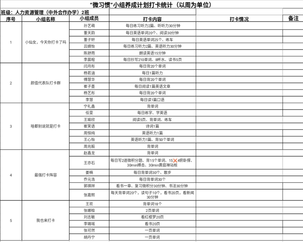 (三)深入互动促发展,“打卡”开创新局面。“不积跬步,无以至千里;不积小流,无以成江海”。习惯的养成从小事开始,就不会觉得困难。因此,为进一步帮助大学生培养良好的习惯,提高自我约束力,积极面对假期生活,支部开展假期学习小组打卡习惯养成活动。该活动以宿舍为一个小组,每个小组设一名组长,每个宿舍建立打卡QQ群,小组成员每天在QQ群里打卡,组长每天收集小组成员的打卡情况并以周为单位汇总汇报。