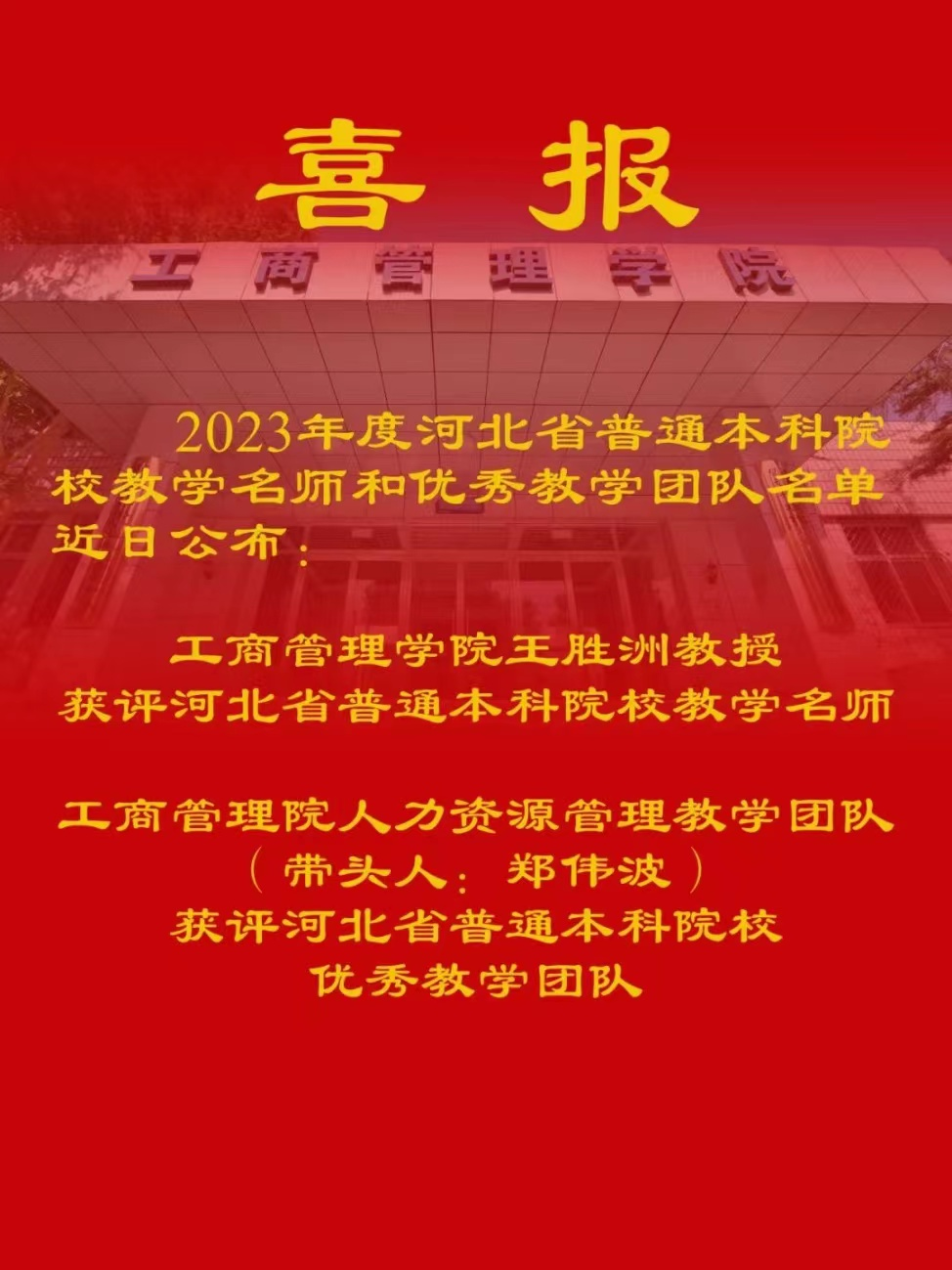 学院王胜洲教授荣获2023年度河北省教学名师,人力资源管理教学团队荣获2023年度优秀教学团队。