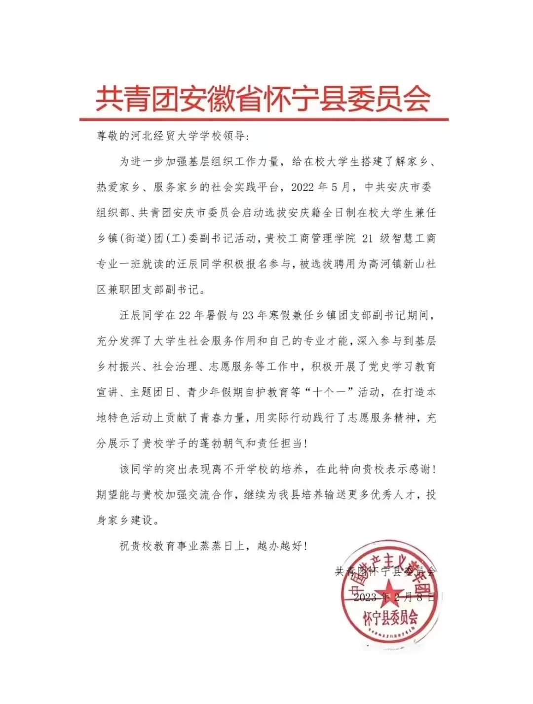 星空体育官网学子汪辰被选拔聘用为高河镇新山社区兼职团支部副书记。