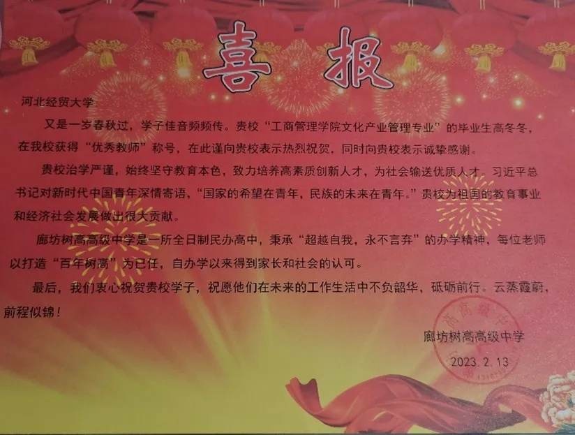 星空体育官网文化产业管理专业毕业生高冬冬荣获廊坊树高高级中学“优秀教师”称号。