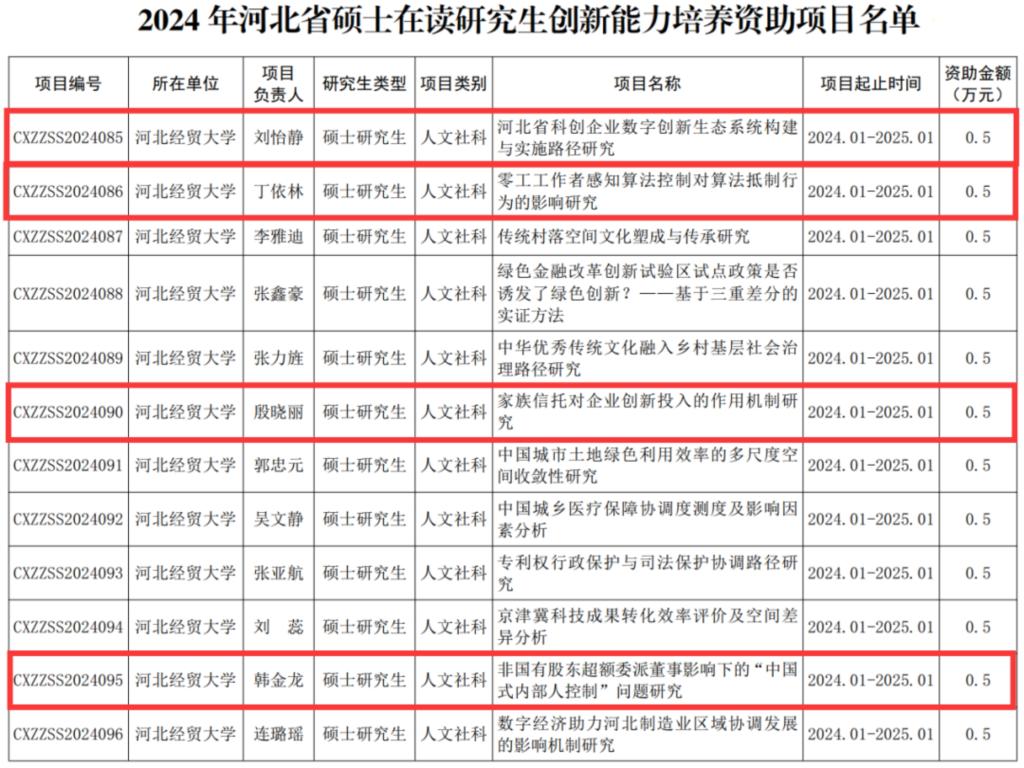 星空体育官网学硕研究生刘怡静(导师:刘兵)主持的项目《河北省科创企业数字创新生态系统构建与实施路径研究》、丁依林(导师:陈亮)主持的项目《零工工作者感知算法控制对算法抵制行为的影响研究》、殷晓丽(导师:杨在军)主持的项目《家族信托对企业创新投入的作用机制研究》、韩金龙(导师:石晓飞)主持的项目《非国有股东超额委派董事影响下的“中国式内部人控制”问题研究》分别获批2024年省级在读研究生创新能力培养资助项目。