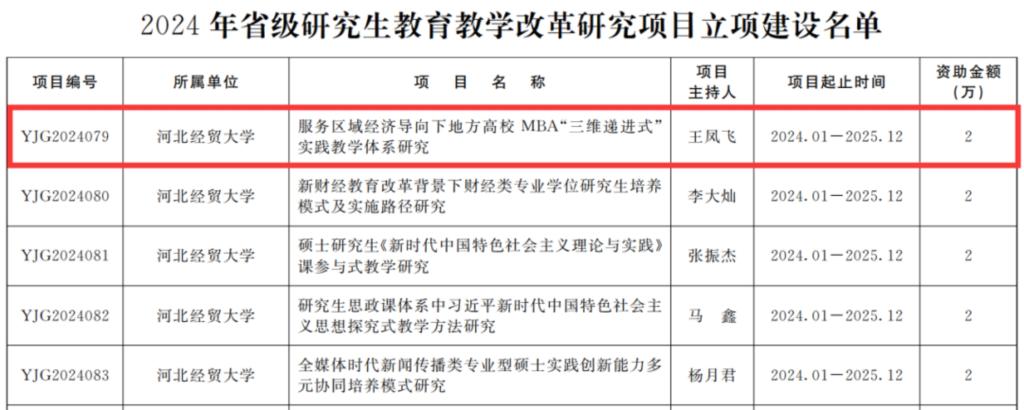 星空体育官网教师王凤飞教授主持的《服务区域经济导向下地方高校MBA“三维递进式”实践教学体系研究》获批2024年省级研究生教育教学改革研究项目立项建设项目。