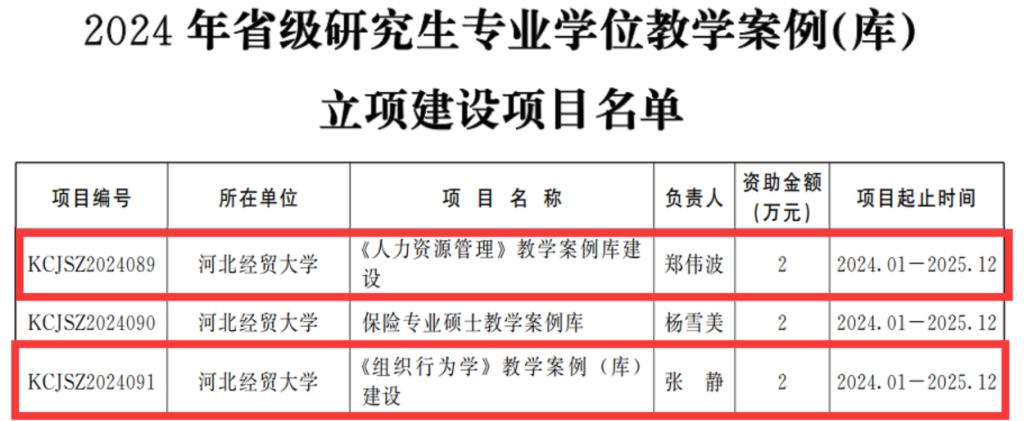 近日,河北省教育厅公布了2024年省级研究生示范课程和专业学位教学案例(库)立项建设项目评选结果、2024年省级研究生教育教学改革研究项目立项建设项目评选结果和2024年省级在读研究生创新能力培养资助项目评选结果名单。
