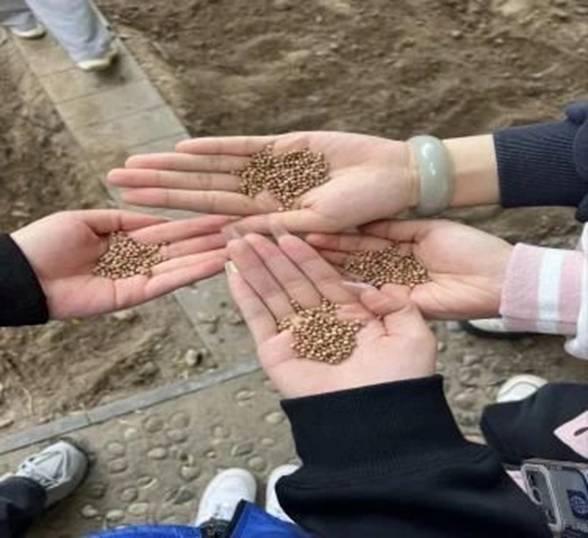 同学们围在一起,仔细地挑选着种子,像是在为未来的希望挑选最优质的守护者。随后,他们轻轻地将种子放入已经翻松的土壤中,小心翼翼地覆上细土,仿佛在为这些幼小的生命筑起一座坚固的堡垒。每一颗种子都承载着他们的期望和梦想,随着季节的轮转,期待着在这片土地上生根发芽,绽放出属于自己的绚烂光彩。