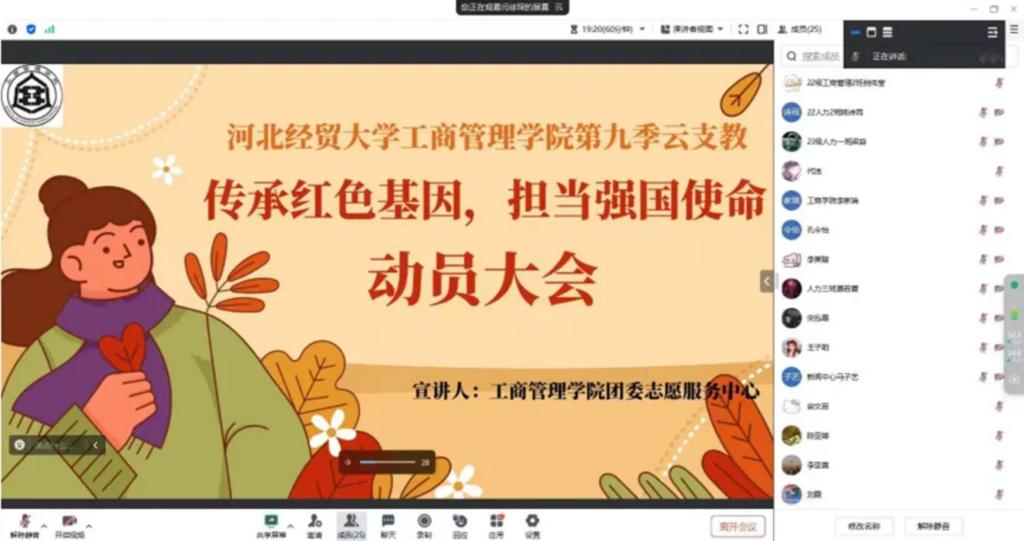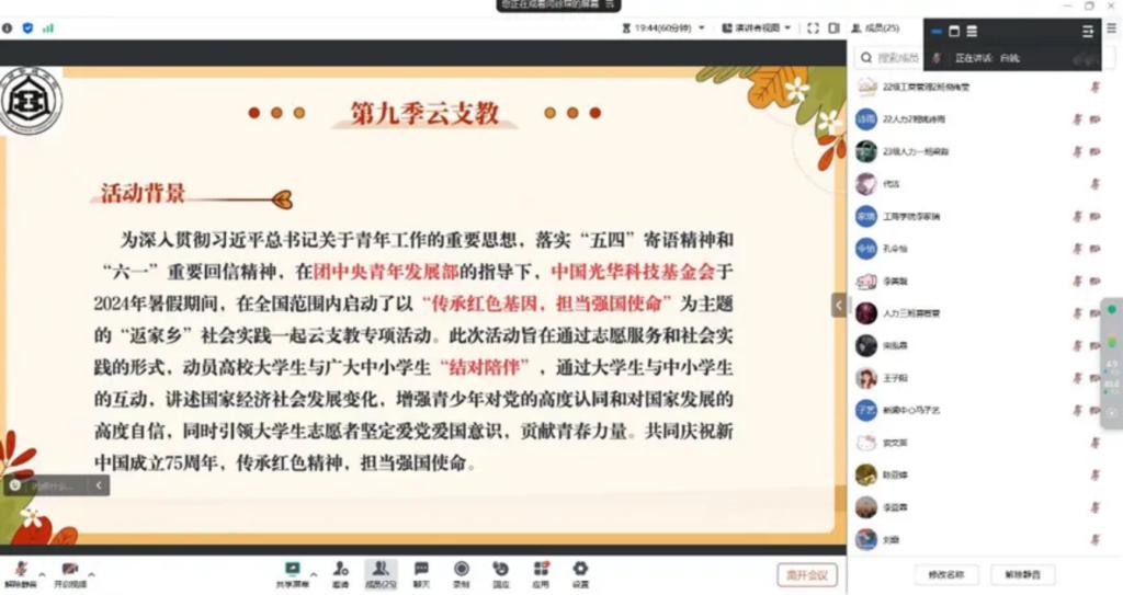 为响应“学习二十大、永远跟党走、奋进新征程”的时代号召,深入贯彻习近平总书记关于青年工作的重要思想,落实“五四”寄语精神和“六一”重要回信精神,星空体育官网积极鼓励学生参与“一起云支教·传承红色基因,担当强国使命”社会实践活动。7月26日,星空体育官方网站召开线上“一起云支教”动员大会,活动由团委志愿服务中心白兢主持,全体云支教大学生志愿者参加。