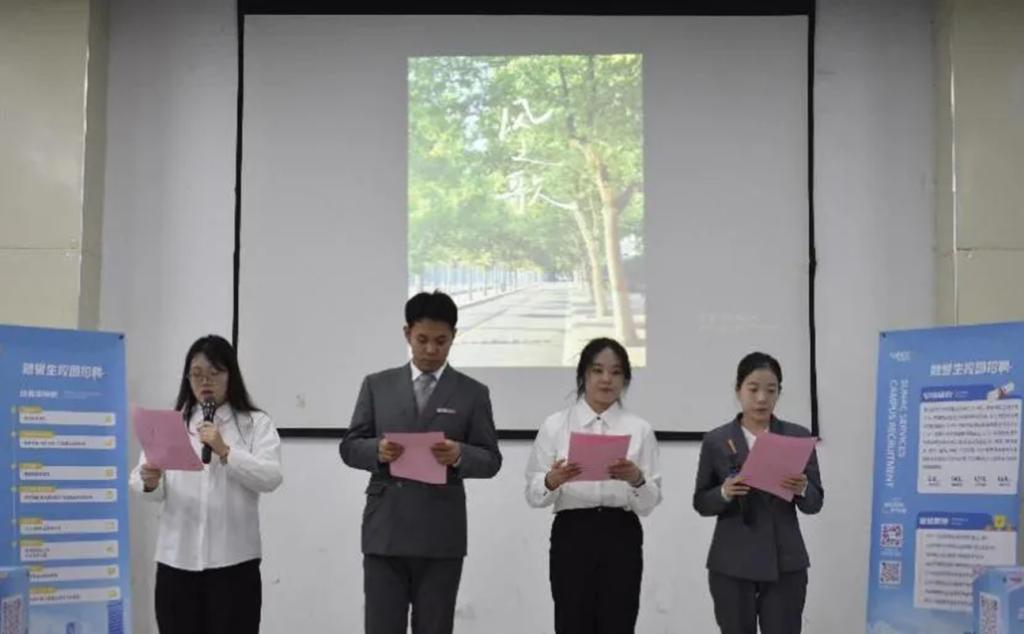 授牌仪式结束后,宣讲会特别邀请了融创服务工作的校友们亲临现场进行了朗诵表演及经验分享。学长学姐们结合自身的经历,讲述了在融创服务的成长故事、收获与感悟。他们用真挚的话语和实用的建议,让同学们对未来的职业选择更加充满信心。最后,工作人员与现场同学开展了互动,在提问环节,同学们也积极表达自己的期待与疑问,融创校招负责人进行了耐心解答,让大家对融创有了更深入的了解,现场气氛热烈。